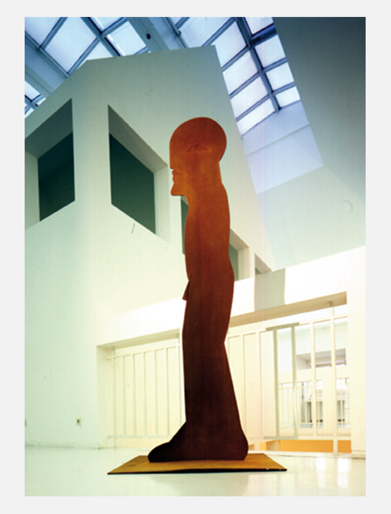 Skulptur in Corten-Stahl mit Gravur und natürlicher Rostpatina. Hergestellt bei Metallbauelemente Selz in Frankfurt.