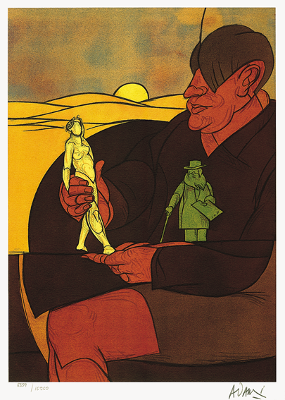 Figuration heute. Eine Mappe mit drei Original-Lithografien von Valerio Adami (“Statuette”), Horst Antes (“Gefleckte Figur mit Reif”) und Enrico Baj (“Der kleine General”). Jede Grafik ist nummeriert und handsigniert. Format jeweils 42 x 30 cm.