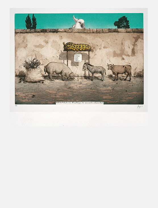 Fröhlicher Gedanke eines Misanthropen Maurilio Minuzzi Original-Radierung in Farben. Gedruckt bei Willi Jesse in Berlin. Auf Zerkall-Bütten, Papierformat 56 x 68 cm. Auflage 100 Exemplare, nummeriert und handsigniert. Preis: 245,00 € Anfrage per eMail Alle Preise inkl. gesetzlicher MwSt. Angaben ohne Gewähr. Fröhlicher Gedanke eines Misanthropen Nächstes Vorheriges Schließen