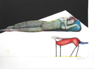 Liegende mit rotem Hund