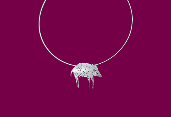 Ein Collier in Massiv-Sterlingsilber 925 mit einem Rubin. Halsreif mit Hakenverschluss. Der Künstlerschmuck ist auf der Rückseite mit einer zusätzlichen Nadel versehen. So kann das Collier auch als Brosche getragen werden.