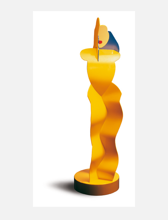Skulptur aus Stahl, mehrfarbig lackiert, montiert auf einem 60 cm hohen Sockel.