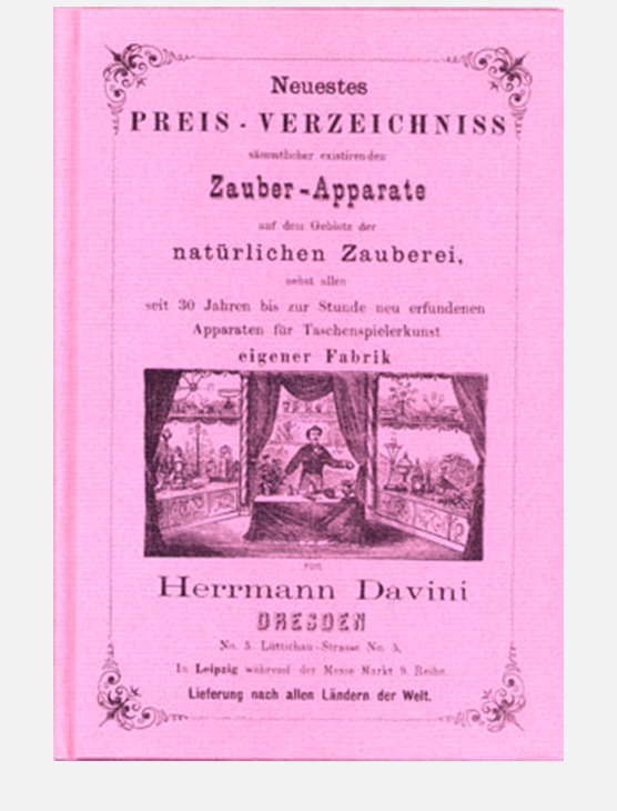 Neuestes Preisverzeichnis sämtlicher existierender Zauber-Apparate auf dem Gebiet der natürlichen Zauberei. Dresden o. J. (ca.1880). 32 Seiten. Auflage 250 nummerierte Exemplare. Pappband. Format 21,7 x 14,7 cm.